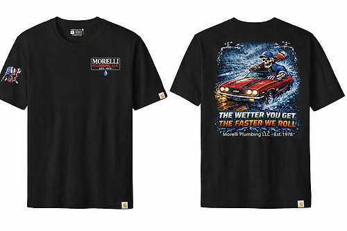 When the job gets messy, Nunzio rolls in. This design captures the unstoppable spirit of the plumber who answers the call no matter the conditions. Featuring a bold skeleton plumber tearing through the rain in a classic muscle car with wrench in hand, the Nunzio shirt represents speed, grit, and the blue-collar work ethic that gets the job done when others won’t.
