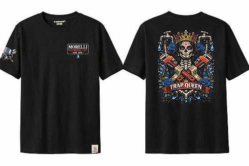 The Lindsay represents the women who aren’t afraid to get their hands dirty and command respect in the blue-collar world. Featuring a bold crowned skull design surrounded by pipes, tools, and flowing water, this shirt celebrates the strength, grit, and confidence of women who run the job and own their craft.